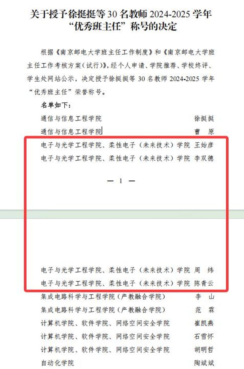近日,南京郵電大學(xué)2024-2025學(xué)年“優(yōu)秀班主任”評選結(jié)果正式揭曉。全校共30位教師獲此殊榮,其中,電子與光學(xué)工程學(xué)院、柔性電子(未來技術(shù))學(xué)院共有四位教師光榮入選,分別是王始彥、李雙德、周緯、陳青云。本次評選注重學(xué)生的真實(shí)反饋,根據(jù)“學(xué)生評價(jià)情況”(即班主任工作測評分?jǐn)?shù))和班主任提交的各類履職材料,對各位班主任老師的履職情況進(jìn)行綜合評定,最終擇優(yōu)入選。電光柔院此次能夠有四位教師脫穎而出,榮獲校級“優(yōu)秀班主任”稱號(hào),是學(xué)校對學(xué)院班主任工作整體水平和育人實(shí)效的高度認(rèn)可。入選老師在日常工作中,始終堅(jiān)守育人初心,恪盡職守,在思想引領(lǐng)、學(xué)業(yè)指導(dǎo)、生涯規(guī)劃、班級管理等方面傾注了大量心力,贏得了學(xué)生一致好評。此次優(yōu)異成績的取得是學(xué)院長期以來堅(jiān)持立德樹人根本任務(wù)、不斷加強(qiáng)和改進(jìn)班主任工作的成果體現(xiàn)。電光柔院將以此為契機(jī),持續(xù)深化班主任隊(duì)伍建設(shè),充分發(fā)揮優(yōu)秀班主任的示范引領(lǐng)作用,不斷探索學(xué)生工作的新思路、新方法,努力提升人才培養(yǎng)質(zhì)量,為學(xué)生的全面成長成才和學(xué)校的高質(zhì)量發(fā)展做出更大貢獻(xiàn)。撰稿:祝騰審核:徐磊編輯:祝騰